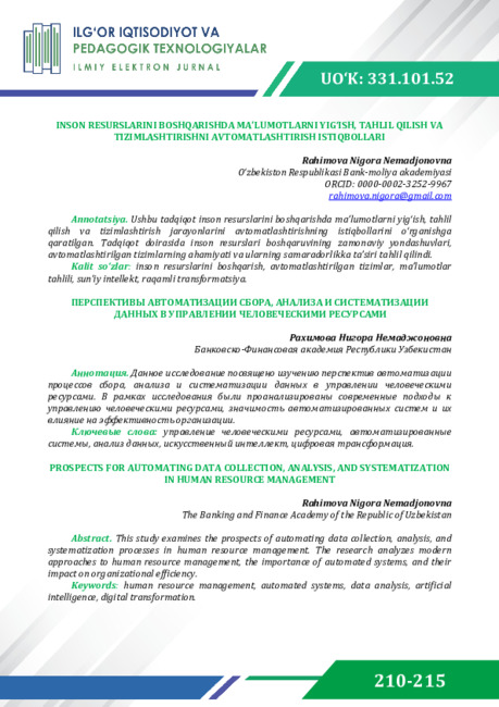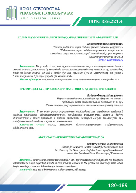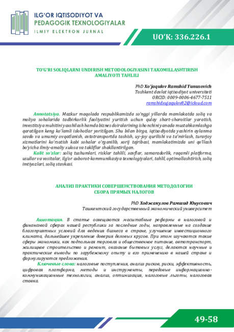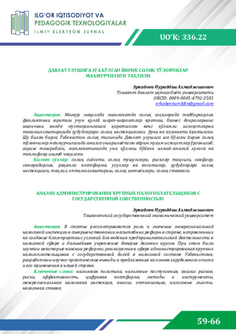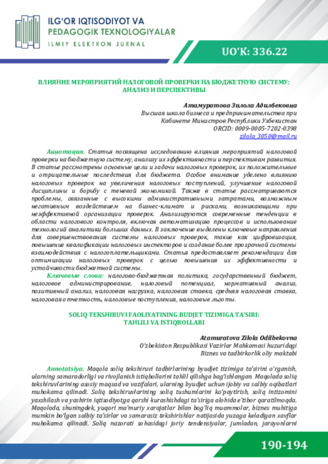 Maqola soliq tekshiruvi tadbirlarining byudjet tizimiga taʼsirini oʻrganish, ularning samaradorligi va rivojlanish istiqbollarini tahlil qilishga bagʻishlangan. Maqolada soliq tekshiruvlarining asosiy maqsad va vazifalari, ularning byudjet uchun ijobiy va salbiy oqibatlari muhokama qilinadi. Soliq tekshiruvlarining soliq tushumlarini koʻpaytirish, soliq intizomini yaxshilash va yashirin iqtisodiyotga qarshi kurashishdagi taʼsiriga alohida eʼtibor qaratilmoqda. Maqolada, shuningdek, yuqori maʼmuriy xarajatlar bilan bogʻliq muammolar, biznes muhitiga mumkin boʻlgan salbiy taʼsirlar va samarasiz tekshirishlar natijasida yuzaga keladigan xavflar muhokama qilinadi. Soliq nazorati sohasidagi joriy tendensiyalar, jumladan, jarayonlarni avtomatlashtirish va katta maʼlumotlarni tahlil qilish texnologiyalaridan foydalanish tahlil qilinadi. Xulosa oʻrnida, soliq tekshiruvi tizimini takomillashtirishning asosiy yoʻnalishlari, xususan, raqamlashtirish, soliq inspektorlari malakasini oshirish va soliq toʻlovchilar bilan oʻzaro hamkorlikning yanada shaffof tizimini yaratish kabilar alohida taʼkidlandi. Maqolada soliq tekshiruvlari samaradorligini va byudjet tizimining barqarorligini oshirish maqsadida ularni optimallashtirish boʻyicha tavsiyalar berilgan.