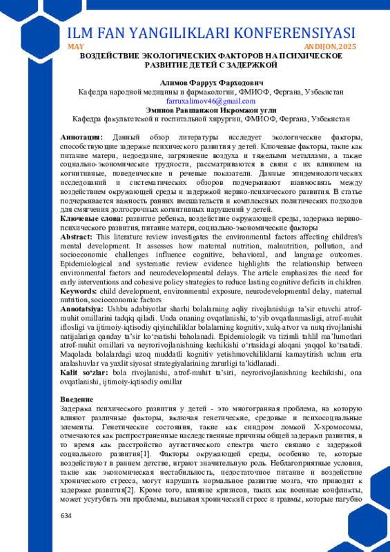 Alimov Ф., & Eminov Р. (2025). Ekologik omillarning rivojlanishi kechikkan bolalar ruhiy taraqqiyotiga ta’siri. in Library, 1(2), 634–639. Retrieved from https://www.inlibrary.uz/index.php/archive/article/view/102454