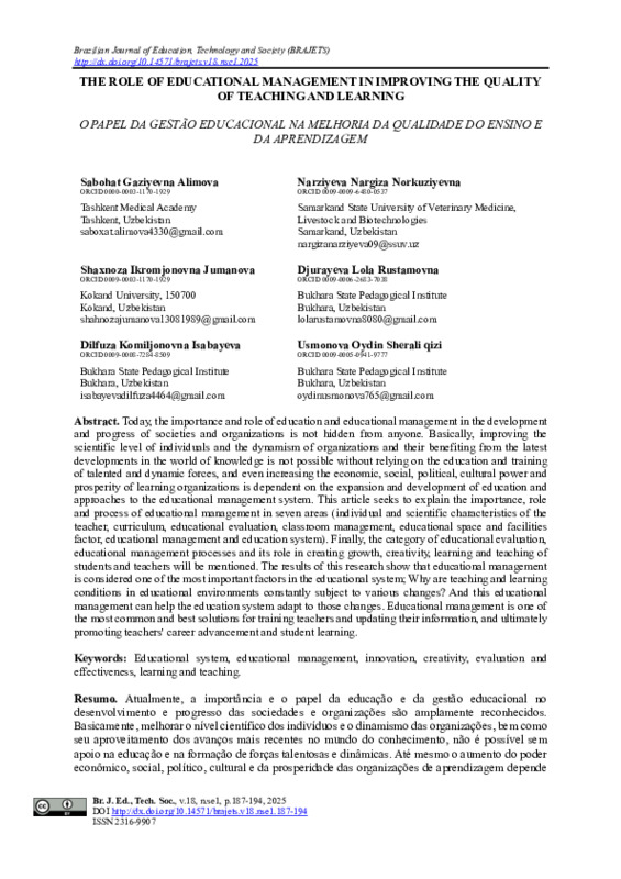 Нарзиева N., Джураева L., & Усмонова O. (2025). Роль образовательного менеджмента в повышении качества преподавания и обучения. in Library, 1(2), 187–194. извлечено от https://www.inlibrary.uz/index.php/archive/article/view/104418