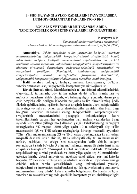 Ushbu maqolada ta’lim jarayonida bo‘lg‘usi veterinary mutaxassislarining tadqiqotchilik kompetensiyalarini rivojlantirish holati, talabalarda tadqiqot faoliyati muammolarini rejalashtirish va yechish usullarini tanlash mezonlari, talabalarda tadqiqotchilik kompetensiyalari va ularning rivojlanish darajasining pedagogik-psixologik xususiyatlari va bosqichlari yoritilgan. Shuningdek, talabalarning tadqiqotchilik kompetensiyalari asosida mashg‘ulotlar jarayonida shakllantirish, tadqiqotchilik kompetensiyalarini shakllantirish metodlari ochib berilgan.