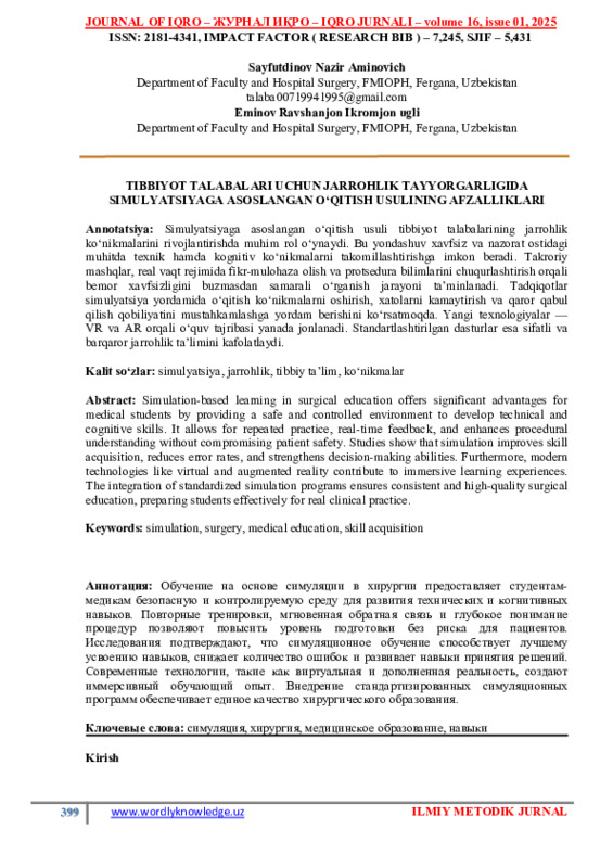 Сайфитдинов N., & Эминов R. (2025). Преимущества метода обучения на основе симуляции в хирургической подготовке студентов-медиков. in Library, 1(2), 399–403. извлечено от https://inlibrary.uz/index.php/archive/article/view/108481