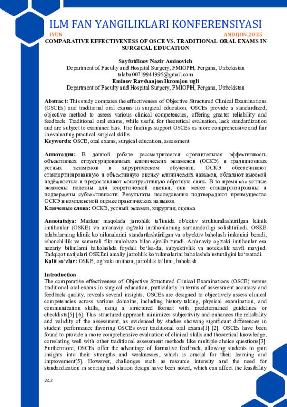 (OSCEs) and traditional oral exams in surgical education. OSCEs provide a standardized,