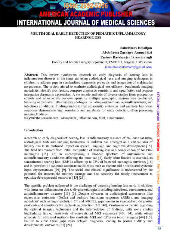 Саккизбоев I., Абдуллаева Z., & Эминов R. (2025). Мультимодальное раннее выявление воспалительной потери слуха у детей. in Library, 1(2), 55–62. извлечено от https://inlibrary.uz/index.php/archive/article/view/122797