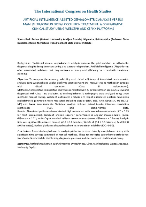 Nigmatov, R., & Ruziev, S. (2025). Artificial intelligence-assisted cephalometric analysis versus manual tracing in distal occlusion treatment: a comparative clinical study using webceph and cephx platforms . in Library, 1(2), 249–249. Retrieved from https://inlibrary.uz/index.php/archive/article/view/130019