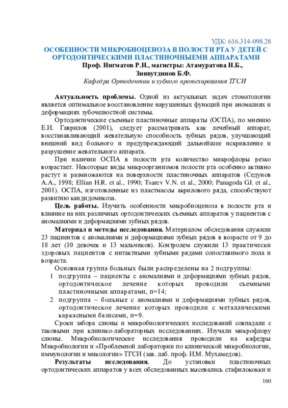 Особенности микробиоценоза в полости рта у детей с ортодонтическими пластиночныеми аппаратами