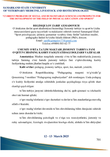 Z.Begimqulov, O.Xaydarov. Barkamol avlodni voyaga yetkazishda umumiy o‘rta ta’lim maktabi jismoniy tarbiya fani o‘qituvchisining o‘rni. Jismoniy tarbiya va sport jurnali – 2022-yil №01 (120), B.23-24.