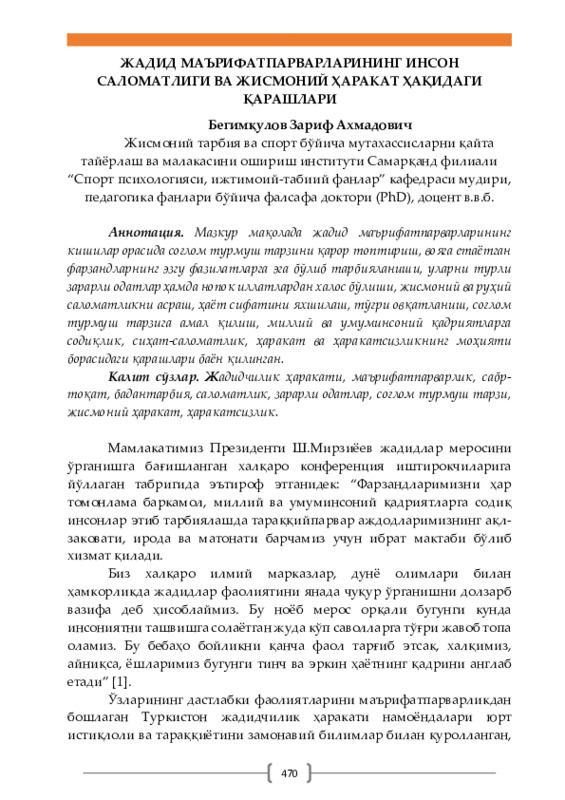 Begimqulov Z.A. Jadid enlighteners are about to protect young people from harmful habits. Frontline social sciences and history journal. Volume 04, Issue 05, Pages: 41-45. SJIF IMPACT FACTOR (2022: 5. 561) (2023: 6. 895) (2024: 7. 9).