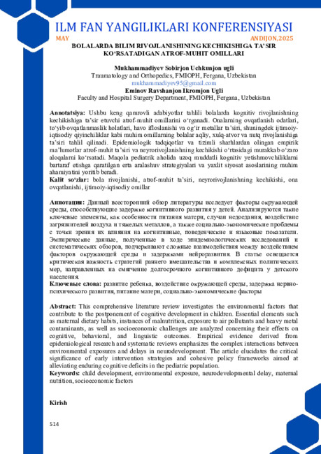 Mukhammadiev, S., & Eminov, R. (2025). Environmental factors influencing delayed cognitive development in children. in Library, 1(1), 514–519. Retrieved from https://inlibrary.uz/index.php/archive/article/view/98967