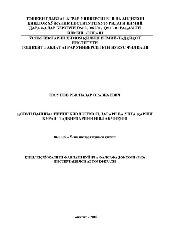 Цель и задачи настоящей диссертационной работы в определенной степени служат выполнению задач, предусмотренных постановлением Президента Республики Узбекистан «О программе развития и реформирования сельского хозяйства в течение 2016-2020 гг.» № ПФ-2460 от 29 декабря 2015 года, постановлением Кабинета Министров Республики Узбекистан «О мерах по совершенствованию структуры и повышению эффективности службы защиты растений» №148 от 29 марта 2004 года, а также законом Республики Узбекистан «О защите сельскохозяйственных растений от вредителей, болезней и сорняков».