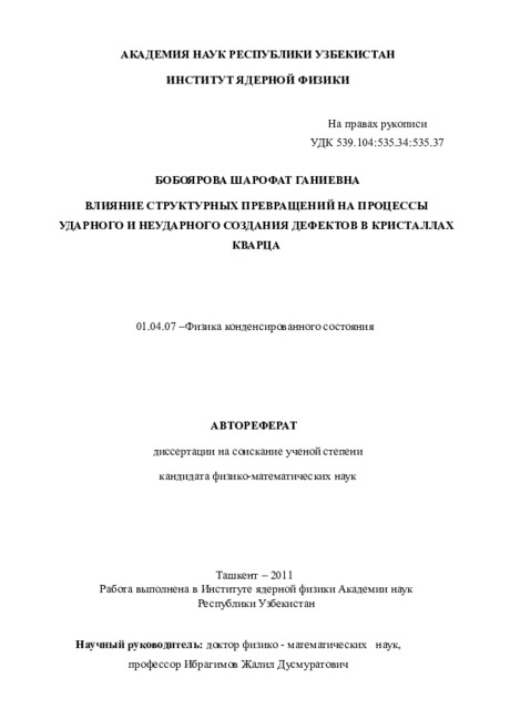 Цель работы: Исследование влияния структурных превращений в кристаллах кварца на процессы создания дополнительных точечных нарушений структуры неударными и ударными путями