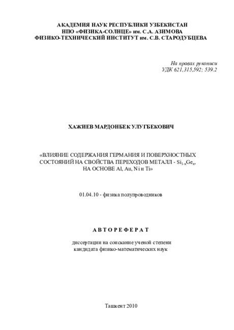 Цель работы: исследование свойств контактов мсталл-8й.хОех в зависимости от типа металлов, с учетом содержания германия и поверхностных состояний в объемных твердых растворах Si|.xGex.