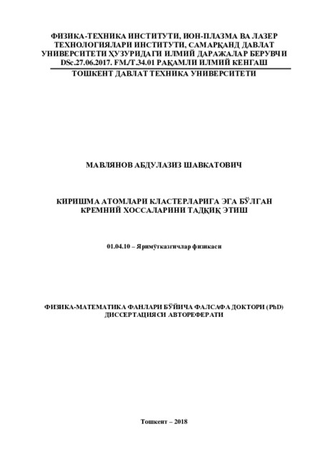 В соответствии со Стратегией действий по дальнейшему развитию Республики Узбекистан, особое внимание уделяется вопросам стимулирования научно-исследовательской и инновационной деятельности, создания эффективных механизмов прикладного применения достижений научноинновационной деятельности. В частности, основное внимание уделяется вопросам развития технологии синтеза новых полупроводниковых материалов, состоящих из элементарных ячеек «кремний - примесный атом». Особо следует отмстить, что данная деятельность осуществляется в рамках объявленного Года поддержки активного предпринимательства, инновационных идей и технологий, нацеленного на получение научных результатов, отвечающих современным требованиям научного развития. В этом плане особое внимание уделяется вопросам исследования оптических, фотоэлектрических и электрических свойств кластерных структур с участием примесных атомов на основе полупроводникового кремния. Вместе с тем, актуальной задачей является численный расчет параметров кремния с кластерными структурами и сравнительный анализ результатов численного расчета с экспериментальными результатами, что позволило бы прогнозировать новые свойства материала и на этой основе обеспечить широкое прикладное применение полупроводникового кремния.