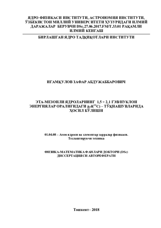 В нашей Республике большое внимание уделяется развитию различных направлений экспериментальной физики и проведению фундаментальных исследований по этим направлениям на мировом уровне. В этом плане удалось достичь значимых результатов в ядерной физике и физике элементарных частиц, в частности: в решении существующих проблем в области ускорительной техники и их практическом применении; в разработке и создании методов определения светимости реакций на ускорителях; в изучении свойств различных мезонов и нуклонных резонансов в ядерной среде; в создании востребованных установок для исследования структуры экзотических ядер. В соответствии со «Стратегией действий по дальнейшему развитию Республики Узбекистан на 2017-2021 гг.», актуальной задачей является повышение эффективности отрасли на основе теоретических и практических исследований в области атомного ядра и физики элементарных частиц за счет внедрения инновационных технологий в определении проблемы происхождения массы элементарных частиц и проверке теоретических моделей квантовой хромодинамики.