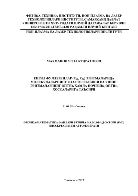 В годы независимости уделяется большое внимание на развитие современной нанофизики и на проведение фундаментальных исследований по этим направлениям на мировом уровне. В этом плане удалось достичь значимых результатов в области синтеза и исследования, уникальных физических свойств различных наноструктурированных систем, к числу которых относятся атомные кластеры, нанотрубки, фуллерены, нанопленки, наногранулы, нанопоры, нанолволокна. В соответствии со Стратегией действия для дальнейшего развития Республики Узбекистан содействие научно-исследовательской и инновационной деятельности, уделение особого внимания созданию эффективных механизмов для реализации научных и инновационных достижений, в этом аспекте в области современной нанофизики имеет важное значение установление основных физических закономерностей процессов самоорганизации и самосборки молекул наноразмерных частиц.