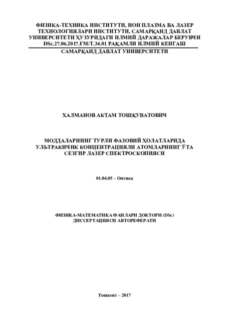 В годы независимости значительное внимание уделялось приоритетному развитию науки Республики Узбекистан, в частности особое внимание было уделено исследованию атомов и аэрозолей или аналогичных сложных молекул для эффективного развития высокочувствительной лазерной спектроскопии. В этой области достигнуты определенные результаты по исследованию ближней границы ионизации атомов и определения эффективных схем возбуждения атомов, а также по изучению морфологических и оптических свойств различных аэрозолей. В соответствии со «Стратегией действий по дальнейшему развитию Республики Узбекистан» особое внимание важно уделить созданию эффективных механизмов внедрений научных и инновационных достижений в практику, создание новых приборов на основе физических механизмов проявления резонансных и нерезонансных процессов взаимодействия лазерного излучения с ультрамалыми концентрациями атомов и аэрозолей вещества в области фотоники лазерной спектроскопии.