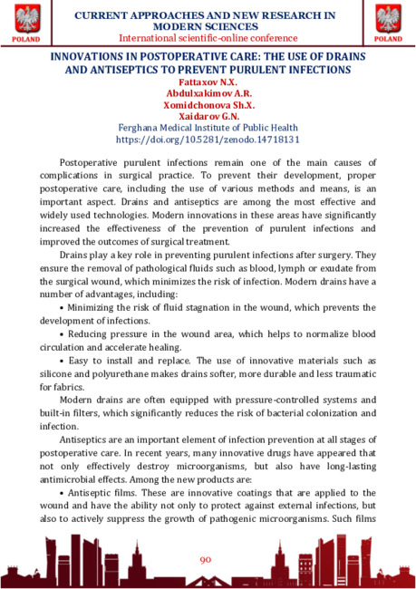 Fattaxov, N., Abdulxakimov , A., Xomidchonova , S., & Xaidarov, G. (2025). INNOVATIONS IN POSTOPERATIVE CARE: THE USE OF DRAINS AND ANTISEPTICS TO PREVENT PURULENT INFECTIONS. Современные подходы и новые исследования в современной науке, 4(1), 90–91. извлечено от https://inlibrary.uz/index.php/canrms/article/view/63901