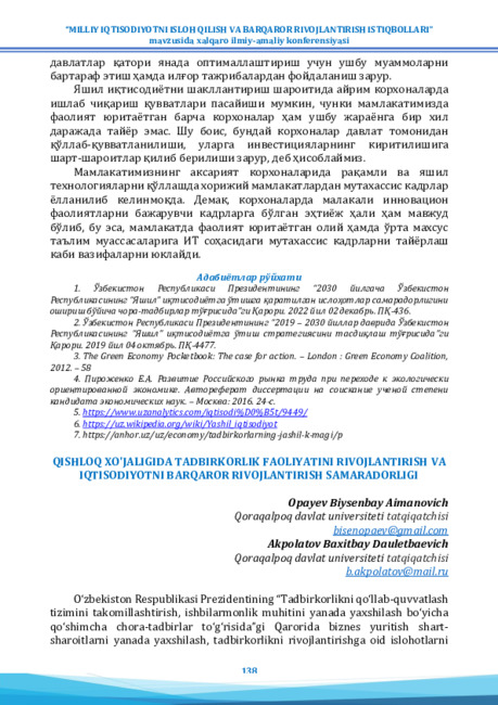 Республикасининг “Яшил” иқтисодиётга ўтишга қаратилган ислоҳотлар самарадорлигини