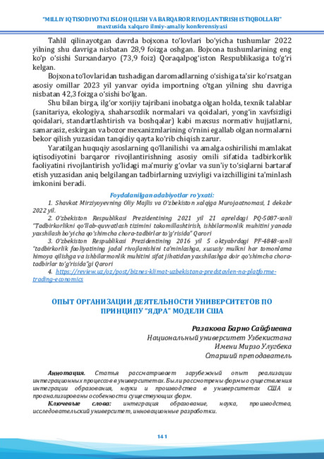“MILLIY IQTISODIYOTNI ISLOH QILISH VA BARQAROR RIVOJLANTIRISH ISTIQBOLLARI”