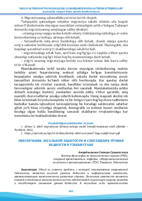 Alimov S. Aholi migratsiyasi ijtimoiy-axloqiy muhit transformatsiyasi omili sifatida.