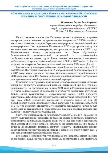 Исламова, Б. (2024). Современные тенденции развития миграционной политики германии в обеспечении легальной занятости . Перспективы реформирования и устойчивого развития национальной экономики, 1(1), 515–518. извлечено от https://inlibrary.uz/index.php/dev-national-economy/article/view/58694