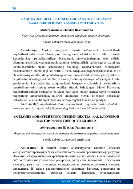 mustahkamlash mumkinligi ko‘rsatib o‘tiladi. Maqolada raqobatbardoshlikka ta’sir