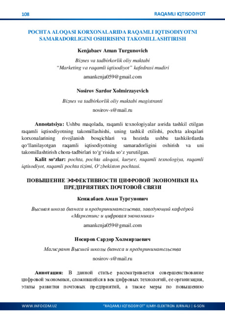 raqamli iqtisodiyotning takomillashishi, uning tashkil etilishi, pochta aloqalari