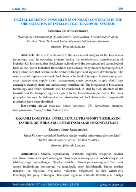 Kalit so‘zlar: raqamli logistika, aqlli shartnomalar, 7R, blokcheyn, strategiya,