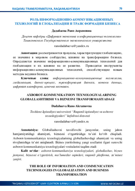rivojlanishiga ko‘rsatayotgan ta’siri, raqamlashtirish natijasida davlatning iqtisodiy,