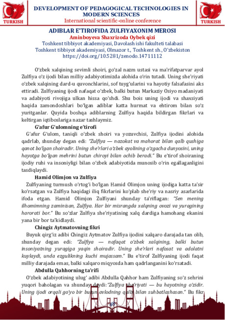 Aminboyeva, S. . (2025). ADIBLAR E’TIROFIDA ZULFIYAXONIM MEROSI. Развитие педагогических технологий в современных науках, 4(1), 48–50. Retrieved from https://www.inlibrary.uz/index.php/dptms/article/view/63334