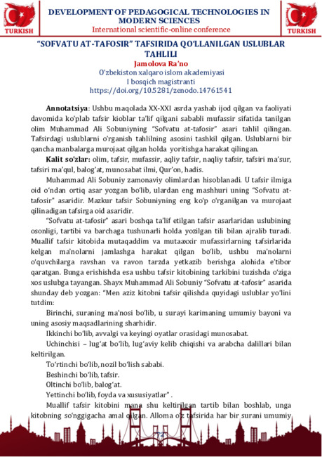 olim Muhammad Ali Sobuniyning “Sofvatu at-tafosir” asari tahlil qilingan.