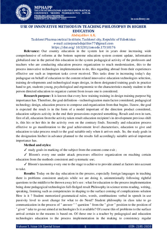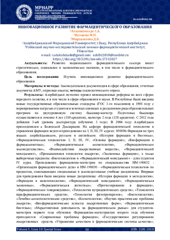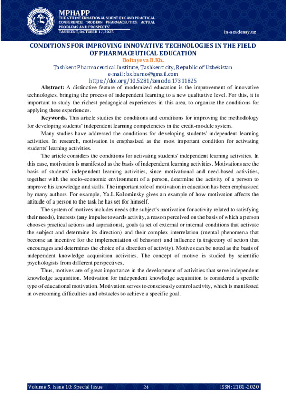 CONDITIONS FOR IMPROVING INNOVATIVE TECHNOLOGIES IN THE FIELD OF PHARMACEUTICAL EDUCATION