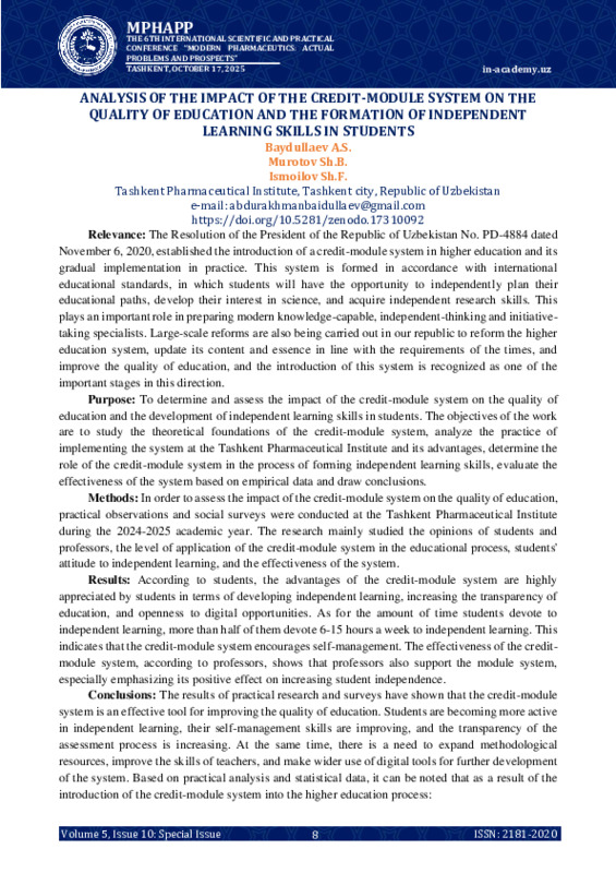 ANALYSIS OF THE IMPACT OF THE CREDIT-MODULE SYSTEM ON THE QUALITY OF EDUCATION AND THE FORMATION OF INDEPENDENT LEARNING SKILLS IN STUDENTS