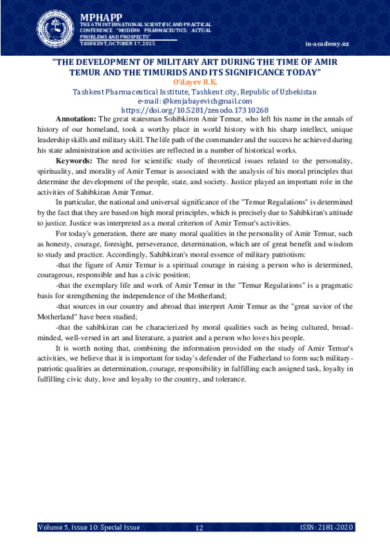 “THE DEVELOPMENT OF MILITARY ART DURING THE TIME OF AMIR TEMUR AND THE TIMURIDS AND ITS SIGNIFICANCE TODAY”