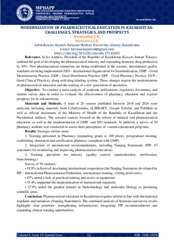 MODERNIZATION OF PHARMACEUTICAL EDUCATION IN KAZAKHSTAN: CHALLENGES, STRATEGIES, AND PROSPECTS