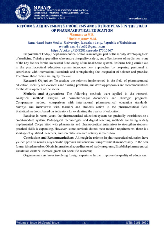 REFORMS, ACHIEVEMENTS, PROBLEMS AND FUTURE PLANS IN THE FIELD OF PHARMACEUTICAL EDUCATION