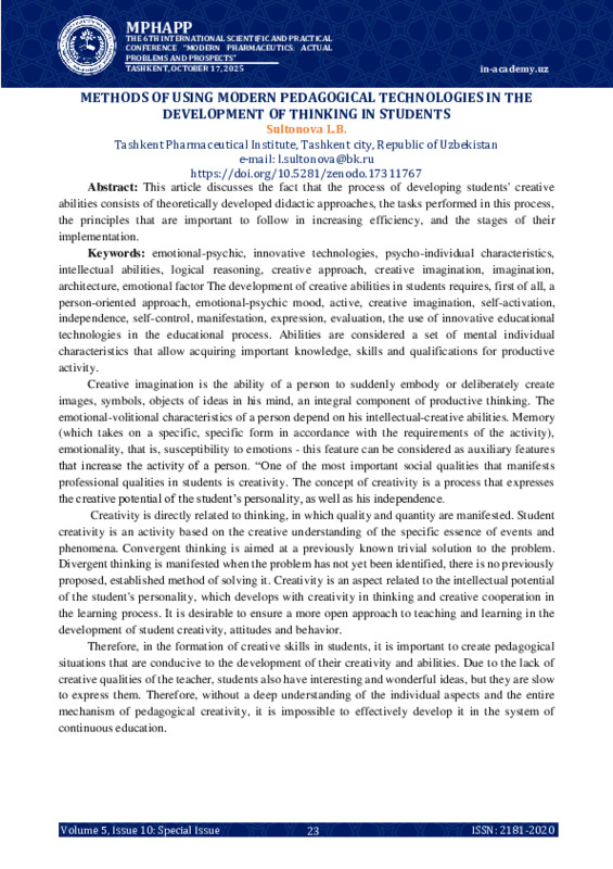 METHODS OF USING MODERN PEDAGOGICAL TECHNOLOGIES IN THE DEVELOPMENT OF THINKING IN STUDENTS
