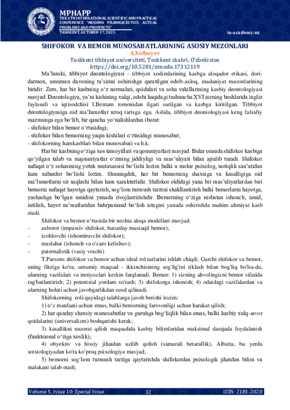 SHIFOKOR VA BEMOR MUNOSABATLARINING ASOSIY MEZONLARI