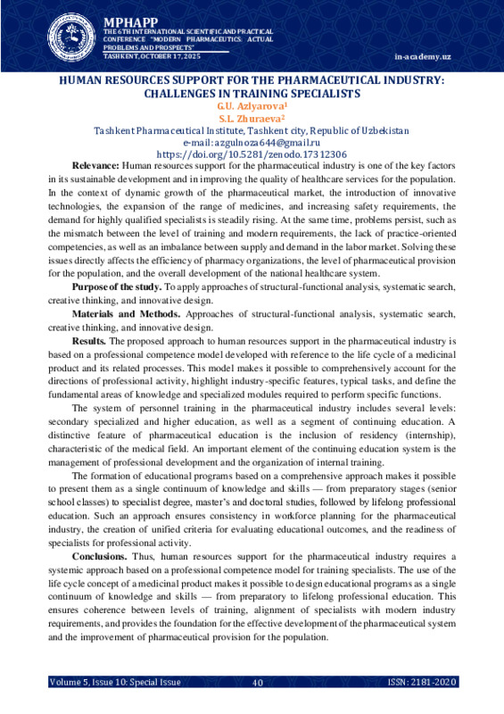 Human resources support for the pharmaceutical industry is one of the key factors in its sustainable development and in improving the quality of healthcare services for the population.