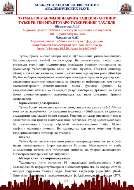 Шевкетова , Л., & Маҳкамов , Н. (2025). ТУҒМА БРОНХ АНОМАЛИЯЛАРИГА ТАШҚИ МУҲИТНИНГ ТАЪСИРИ. ГЕН-МУҲИТ ЎЗАРО ТАЪСИРИНИНГ ТАҲЛИЛИ. Международная конференция академических наук, 4(1), 54–56. извлечено от https://inlibrary.uz/index.php/icas/article/view/63299