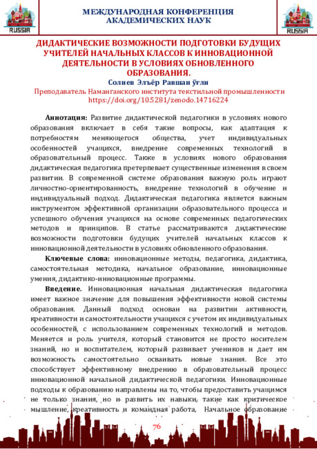 Развитие дидактической педагогики в условиях нового образования включает в себя такие вопросы, как адаптация к потребностям меняющегося общества, учет индивидуальных особенностей учащихся, внедрение современных технологий в образовательный процесс. Также в условиях нового образования дидактическая педагогика претерпевает существенные изменения в своем развитии. В современной системе образования важную роль играют личностно-ориентированность, внедрение технологий в обучение и индивидуальный подход. Дидактическая педагогика является важным инструментом эффективной организации образовательного процесса и успешного обучения учащихся на основе современных педагогических методов и принципов. В статье рассматриваются дидактические возможности подготовки будущих учителей начальных классов к инновационной деятельности в условиях обновленного образования.