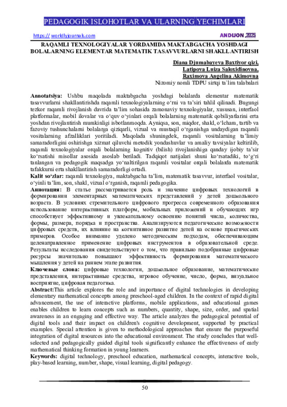 Tadjibaeva D. I. Development of preschool children’s mathematical concepts through digital games // Journal of Early Education. – 2020. – №3. – B. 45–50.