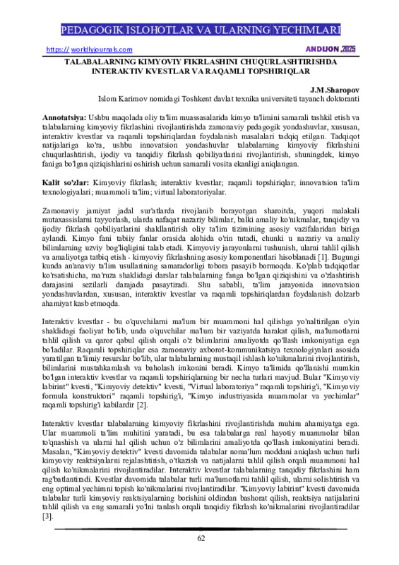 Kimyoviy fikrlash; interaktiv kvestlar; raqamli topshiriqlar; innovatsion ta'lim
