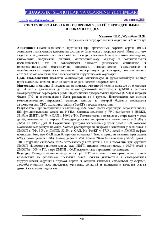 Хакимов , Ш., & Жумобоев , . и. (2025). СОСТОЯНИЕ ФИЗИЧЕСКОГО ЗДОРОВЬЯ У ДЕТЕЙ С ВРОЖДЕННЫМИ ПОРОКАМИ СЕРДЦА. International Journal of Science, 3(1), 203. Retrieved from https://inlibrary.uz/index.php/ijsci/article/view/131251