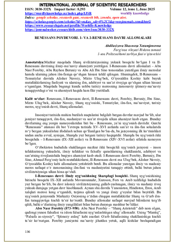 hamda ularning jahon ilm-faniga qo‘shgan hissasi tahlil qilingan. Shuningdek, II-Renessans –