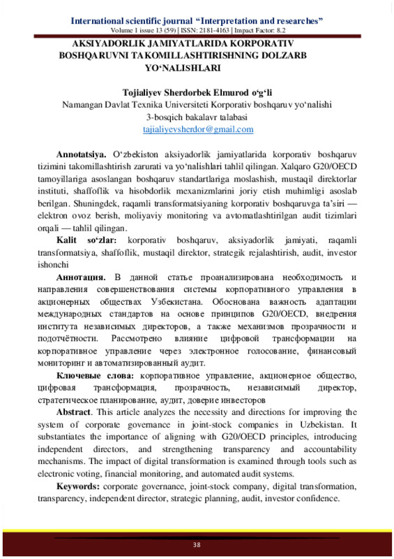 O‘zbekiston aksiyadorlik jamiyatlarida korporativ boshqaruv tizimini takomillashtirish zarurati va yo‘nalishlari tahlil qilingan. Xalqaro G20/OECD tamoyillariga asoslangan boshqaruv standartlariga moslashish, mustaqil direktorlar instituti, shaffoflik va hisobdorlik mexanizmlarini joriy etish muhimligi asoslab berilgan. Shuningdek, raqamli transformatsiyaning korporativ boshqaruvga ta’siri — elektron ovoz berish, moliyaviy monitoring va avtomatlashtirilgan audit tizimlari orqali — tahlil qilingan.