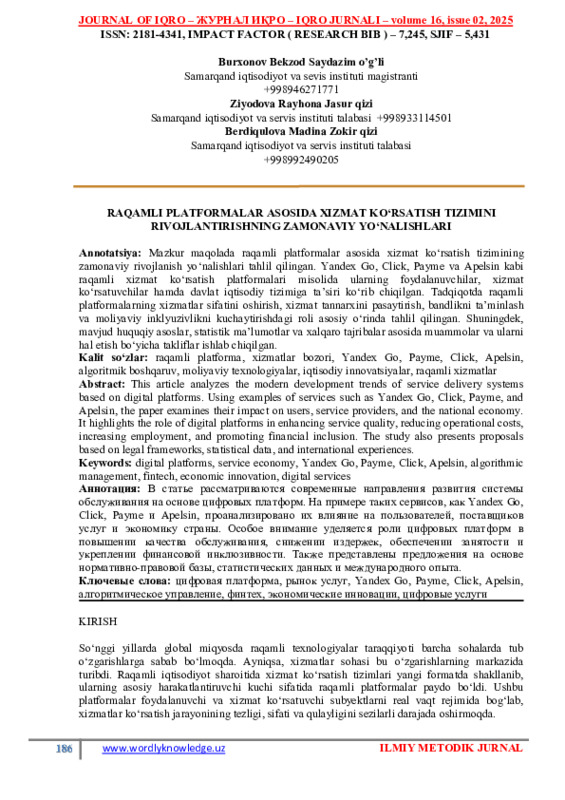 Mazkur maqolada raqamli platformalar asosida xizmat ko‘rsatish tizimining