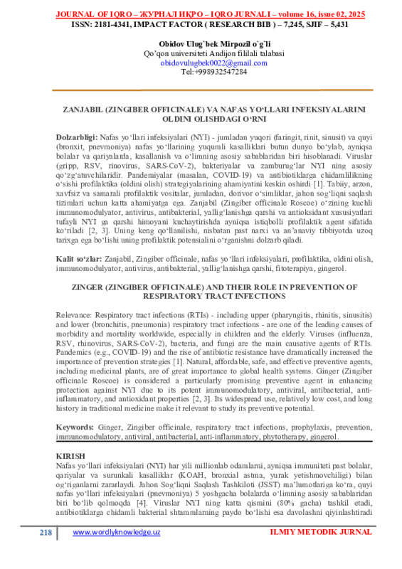 Ushbu maqolaning maqsadi zanjabilning nafas yo‘llari infeksiyalarini oldini olishdagi o‘rni va