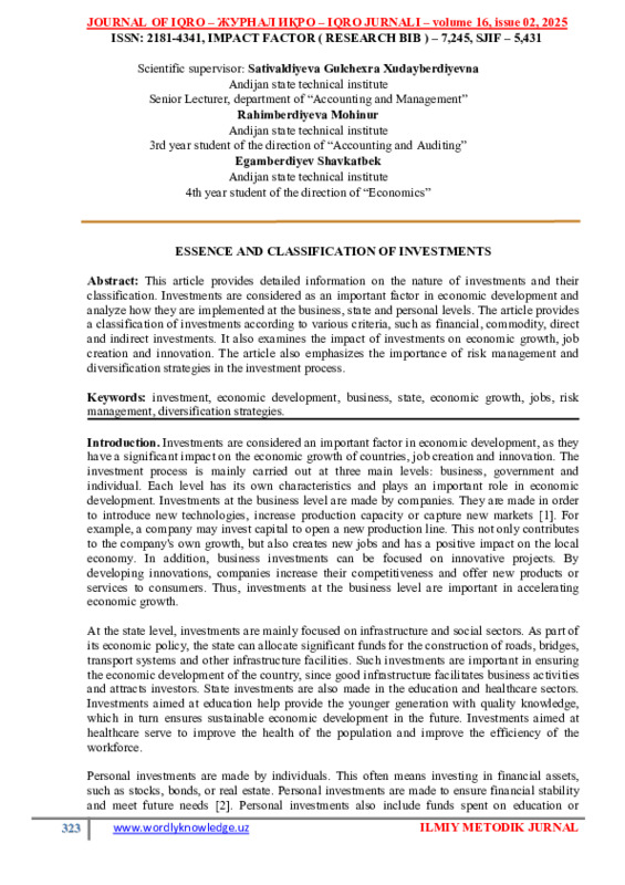 Dildora, Djullibayeva. "O’ZBEKISTONDA INVESTITSIYANING TUTGAN O'RNI