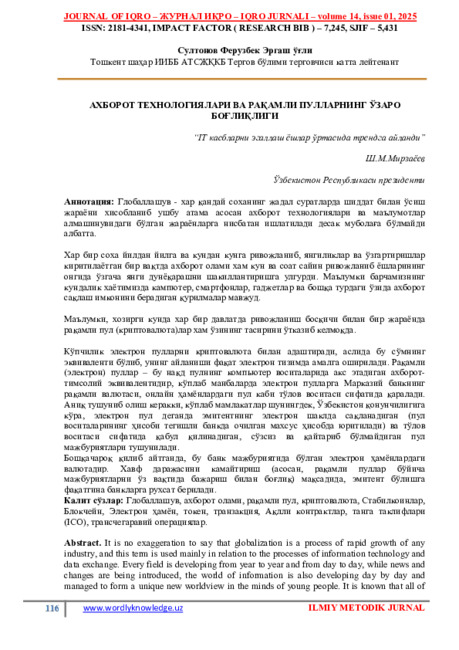 АХБОРОТ ТЕХНОЛОГИЯЛАРИ ВА РАҚАМЛИ ПУЛЛАРНИНГ ЎЗАРО БОҒЛИҚЛИГИ