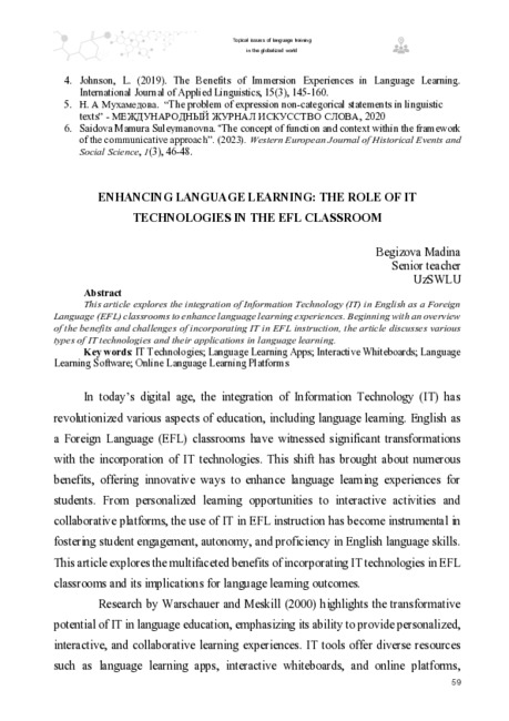 Begizova , M. . . (2024). Enhancing language learning: the role of IT technologies in the EFL classroom. Topical Issues of Language Training in the Globalized World, 1(1). Retrieved from https://inlibrary.uz/index.php/issues-language-training/article/view/33103